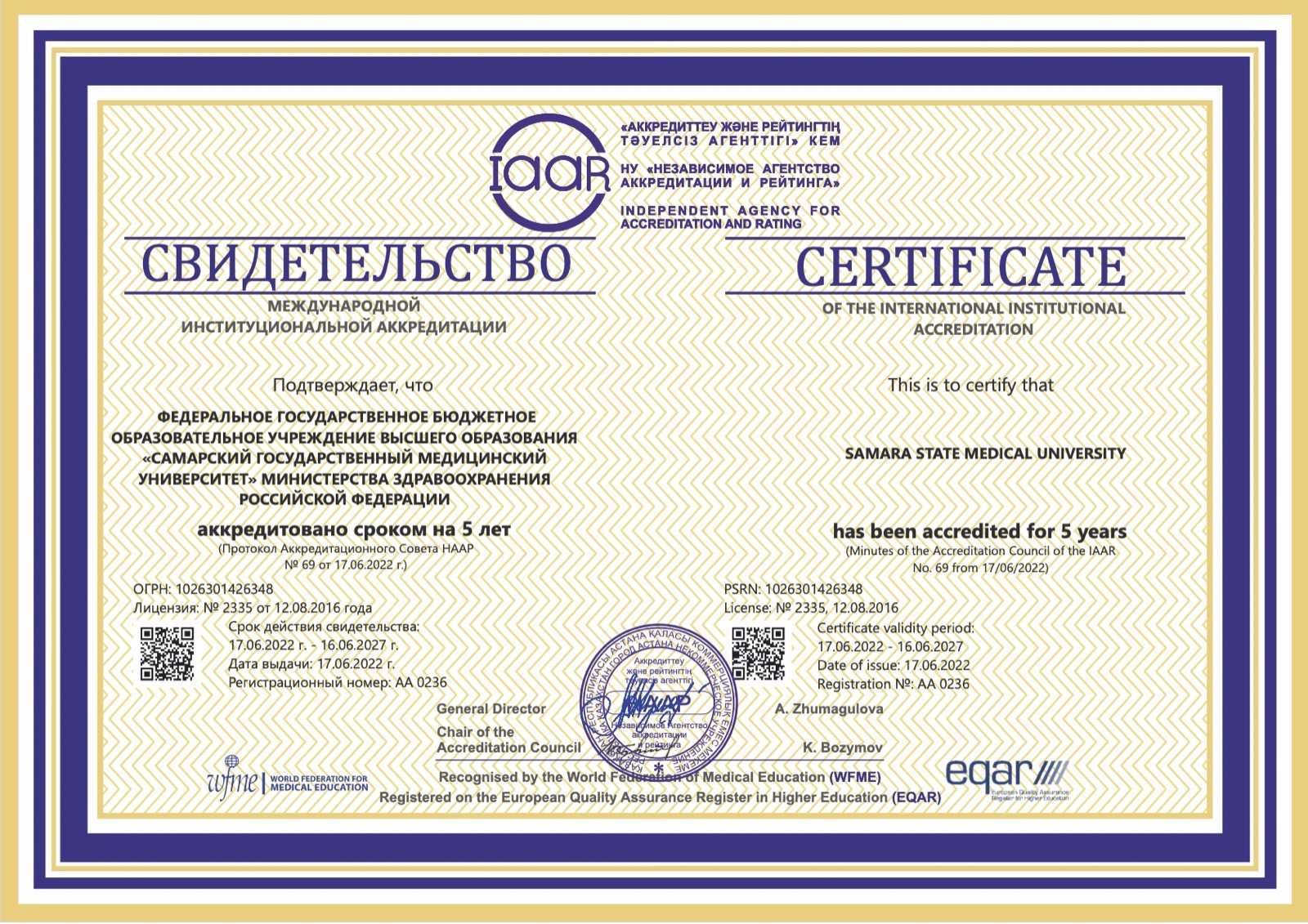 Based on the results of the external expert evaluation by the Independent Accreditation and Rating Agency (NAAR/IAAR) that took place at SamSMU on 17–19 May 2022, the IAAR Accreditation Council decided to grant institutional accreditation to the University for the period of 5 years.